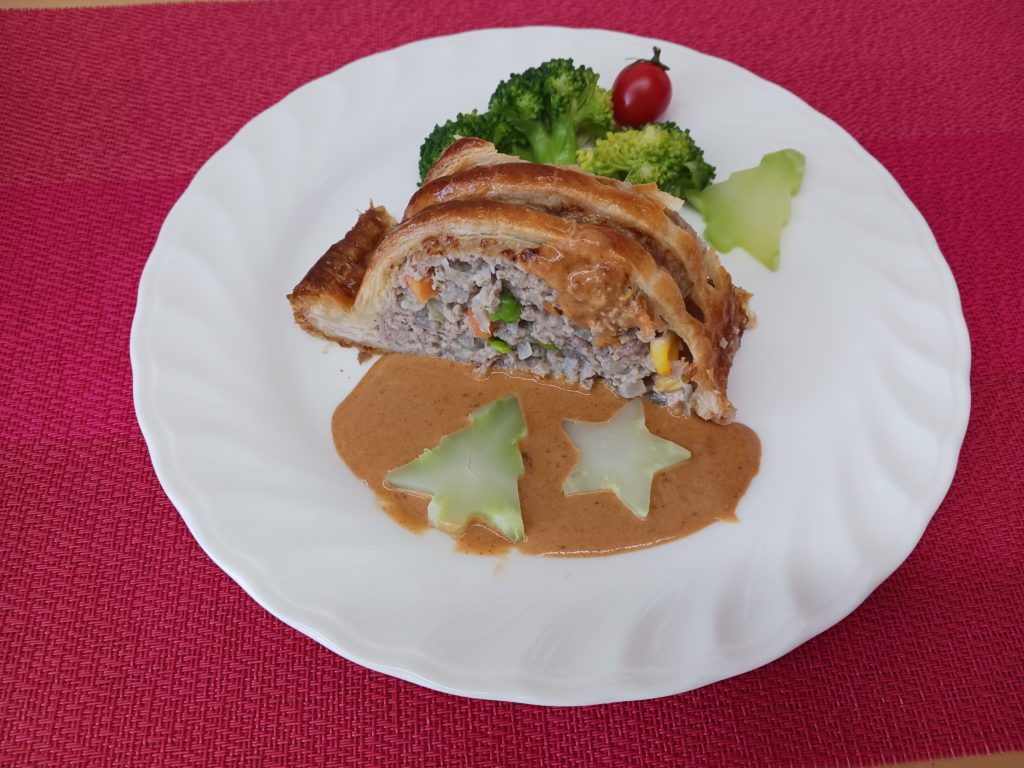 ひき肉をパイシートに包みオーブンで焼くと見た目も豪華に✨✨